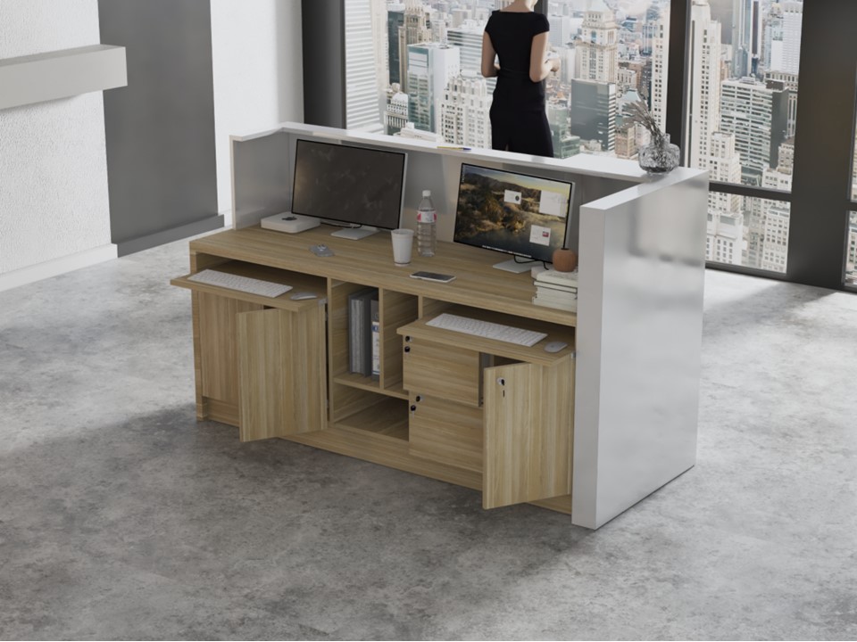 The standard Eleva Reception Desk is 200 x 80cm with white HPL laminate and American Oak HPL laminate. These sizes and colours are fully customisable according to your specification if needed