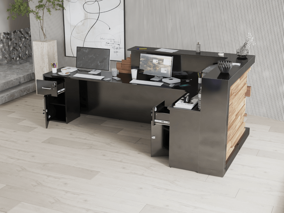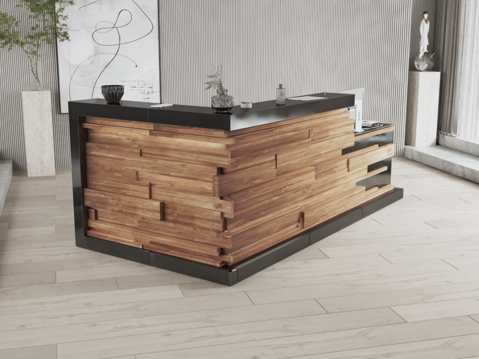 Fusion is a stunning masterpiece clad with layered wood panels artfully interspersed with soft LED lighting. This design seamlessly marries innovation and elegance, creating an ambiance that transcends the ordinary. With Fusion, your reception area becomes an enchanting space where the interplay of light and texture sets a tone of sophistication.