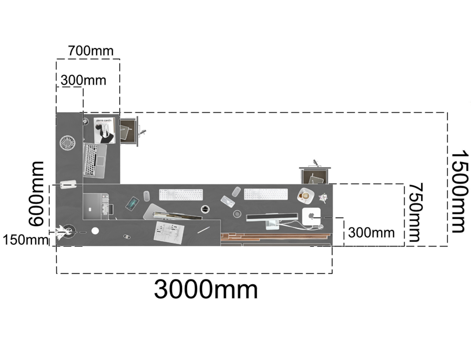The standard Fusion Reception Desk is 300 x 75cm with black HPL melamine and Oak. These sizes and colours are fully customisable according to your specification if needed