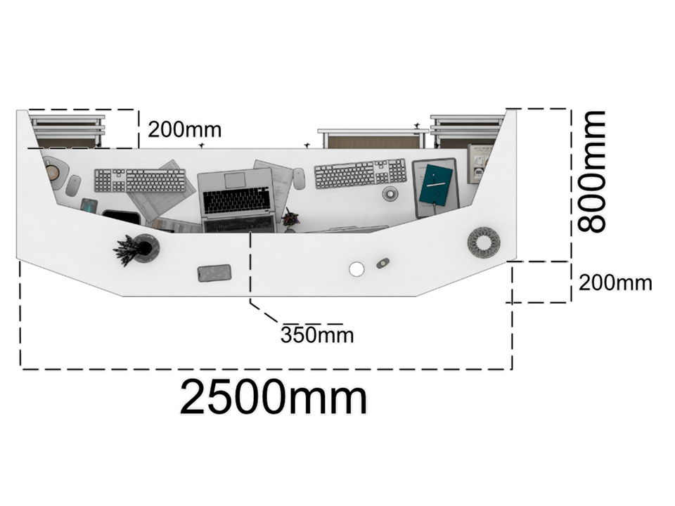 The standard Prestige Reception Desk is 250 x 80cm with RAL9003 Corian. These sizes and colours are fully customisable according to your specification if needed