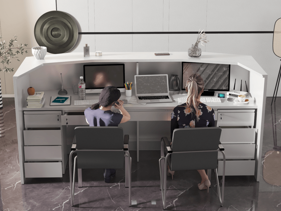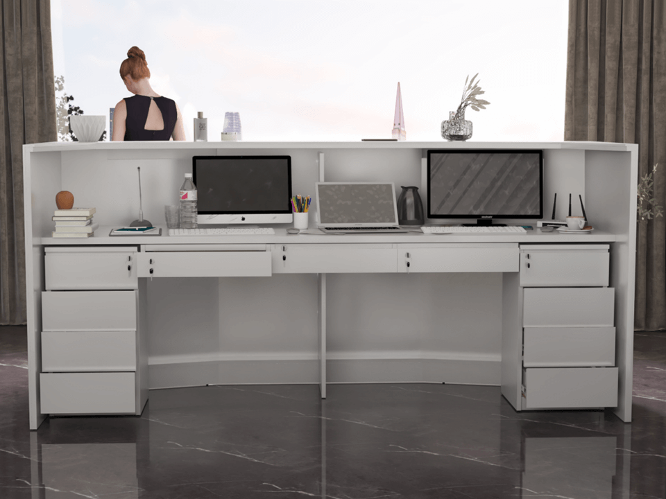 All our products are constructed using premium, durable materials that are carefully selected to withstand daily use and maintain their elegance over time. Our desks often feature a combination of high-quality wood, metal, and glass elements. This blend of materials ensures not only a long-lasting and robust structure but also a sophisticated appearance that will endure the test of time, making it a valuable investment for your reception area.